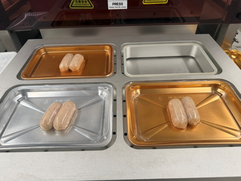 The VSP450A uses a vertical operation method where pre-made trays are loaded into a custom-designed mold. The machine automatically covers the product with heated skin film, applies a powerful vacuum to remove all atmosphere, and seals the film tightly to the tray rim and product surface.
